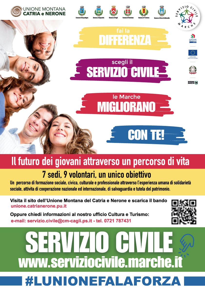 Un’opportunità di crescita e di esperienza professionale in ambito culturale per i giovani tra i 18 e i 28 anni. La Regione Marche ha approvato il progetto presentato dall’Unione Montana del Catria e Nerone per l’edizione 2025-2026, finalizzato alla ricerca di giovani volontari di Servizio Civile da destinare a tutti i suoi Comuni membri e, alla stessa Unione Montana. I volontari assegnati all’Unione Montana da distribuire nei 6 Comuni aderenti è di 9 unità su un totale di 392 posti previsti dal bando regionale.